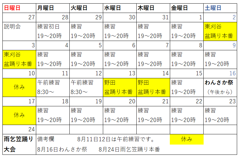 黄色の部分はお休みです。練習全部出なくても大丈夫です。6日練習風景撮影と11日~15日(わんさか祭前練習),18日~23日(本番前練習)は出来るだけ練習来てください。